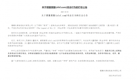 关于搜服搜服(sfsf.com)违法行为的打击公告 jinnian金年会信息技术有限公司(以下简称“我司”)经株式会社传奇IP 、RENAISSANCE...
